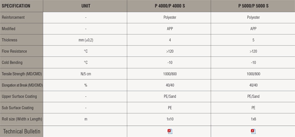 It is APP (Atactic Polypropylene) modified plastomeric waterproofing membrane with non-woven spunbond polyester felt; both sides are coated with polyethylene film or silica sand; suitable use in bridge, viaducts and roads.